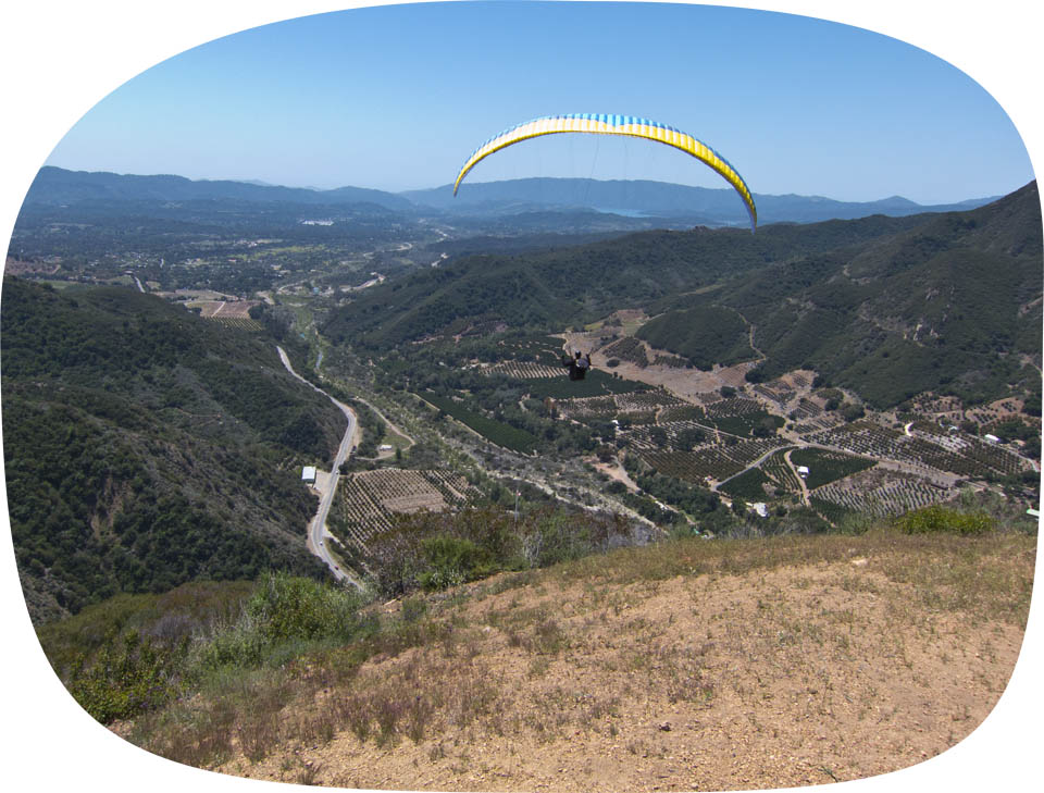 The Nuthouse is a hike up launch in Ojai off Hwy 33 about 450 yards up the road from the Cozy Dell Trailhead or 350 yards up from the Friends Ranch Packing House (blue (currently white) building with a white roof).  The initial 20 to 50 yards of the Nuthouse Trailhead is on private property, but just a little ways in it is Los Padres National Forest.  The trek to launch is perhaps more of a climb than a hike.  If you have a 50 pound pack, I recommend gloves or a walking stick.  There are some steep sections that result in reaching out for hand support (many pilots use a walking stick, but I grapple with both hands).  Good footgear is recommended.  Long sleeves and pant legs are recommended even in the heat to avoid bug bites and scratches.  I carry a hand towel to dab the sweat from my eyes, others wear headbands.  Budget a quart of water for the hike in addition to what you want to fly with for emergency reserve.