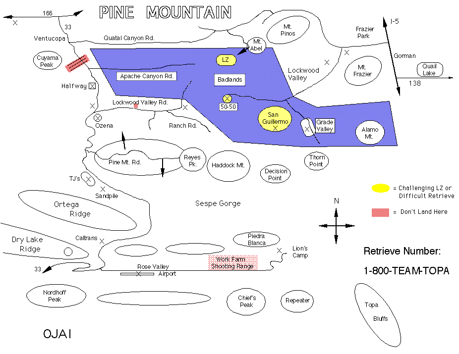 The primary south side LZ's are a 150 ft. by 200 ft. dirt turn-out from highway 33 and a large but brush strewn field also adjacent to 33 but about half a mile northwest. Both LZ's lie near a riverbed cut through a canyon between two ridges. The wind typically funnels northwest or southeast (parallel to the canyon), but both LZ's may be thermally on soarable days. The primary north side LZs are a large fenced field (with a wind-sock) in back of the Ozena ranger station and a large field at the corner of 33 and Lockwood Valley Rd. Many other north side LZ's exist, however. All along 33 north of Ozena is landable in fields or the creek bed just west of the road. Also many fields along Lockwood Valley Rd. paralleling the launch ridge 1 to 2 miles north of the ridge are landable, though some contain power lines.